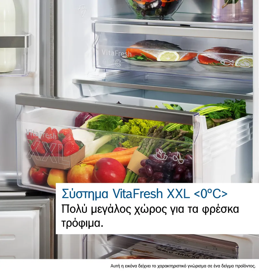 Το σύστημα VitaFresh XXL είναι εδώ για να κρατήσει τα φρούτα, τα λαχανικά, το κρέας και το ψάρι σου φρέσκα για περισσότερο. Ο χώρος του ψυγείου είναι άνετος και ιδανικός για όλα τα αγαπημένα σου τρόφιμα.