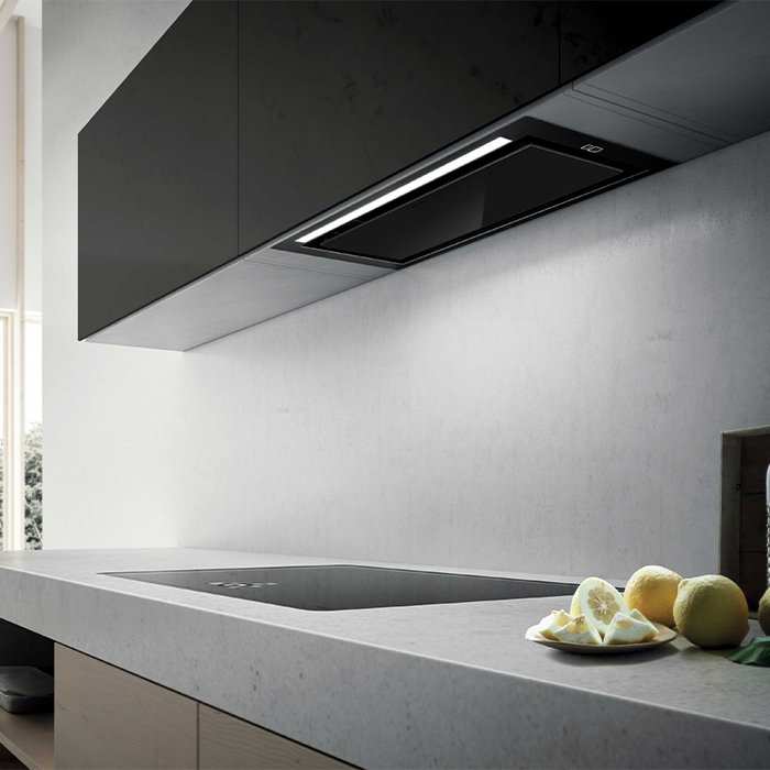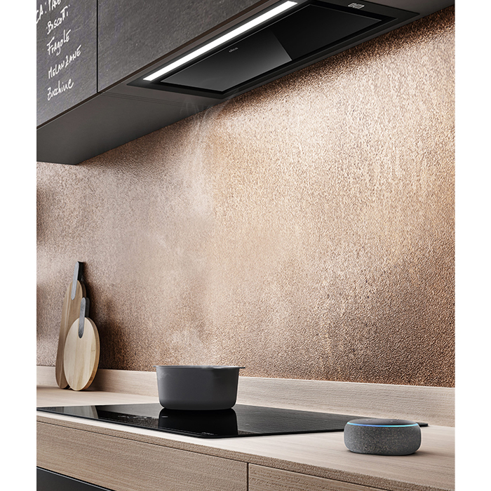 Η απορρόφηση κατανέμεται ομοιόμορφα σε όλη την περίμετρο της συσκευής, εξασφαλίζοντας εξαιρετική απόδοση και αποτελεσματικότητα στην απομάκρυνση των ατμών και οσμών από την κουζίνα. Το σημείο απορρόφησης είναι μελετημένο ώστε να παραμένει εντελώς κρυμμένο πίσω από ένα κομψό και μοντέρνο πάνελ, προσδίδοντας στην κουζίνα μια αίσθηση καθαρότητας και αρμονίας.