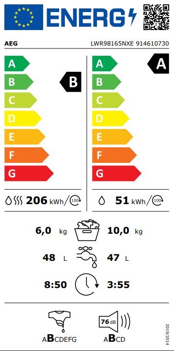AEG LWR98165NXE Πλυντήριο-Στεγνωτήριο Ρούχων 10kg/6kg, 1600 Στροφές, με Ατμό & Wifi, A/B, Λευκό