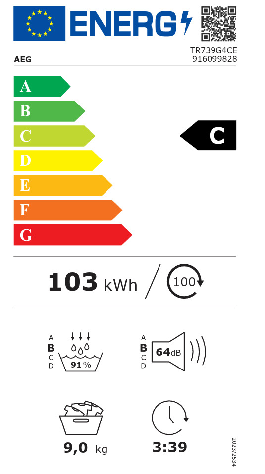 AEG TR739G4CE Στεγνωτήριο Ρούχων 9kg, με Αντλία θερμότητας & Wifi, C, Λευκό