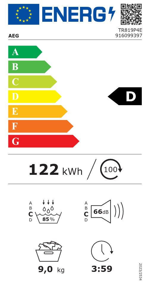 AEG TR819P4E Στεγνωτήριο Ρούχων 9kg, με Αντλία Θερμότητας, D, Λευκό