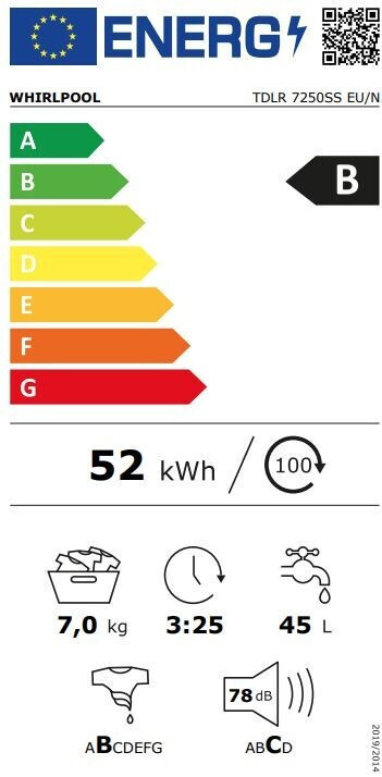 Whirlpool TDLR 7250SS Πλυντήριο Ρούχων άνω Φόρτωσης 7kg, 1200 στροφών, Β, Λευκό