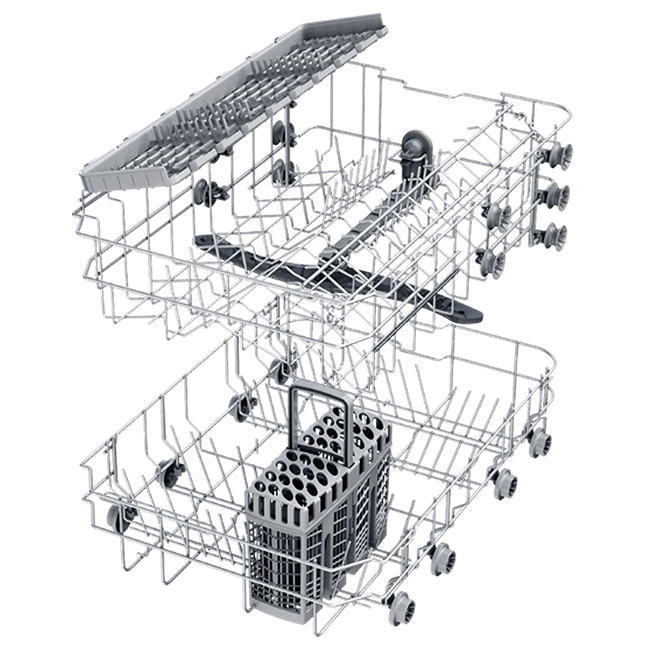 ✓ Η χωρητικότητα των 9 σερβίτσιων, τα δύο καλάθια και το ειδικό καλάθι για μαχαιροπίρουνα επιτρέπουν άνετη και οργανωμένη τοποθέτηση των σκευών