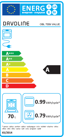 Davoline OBL 7009 VALUE Φούρνος άνω πάγκου 70lt, χωρίς Εστίες, με Υδρόλυση, Π59,5εκ, Α, Μαύρο (3 Έτη Εγγύηση)