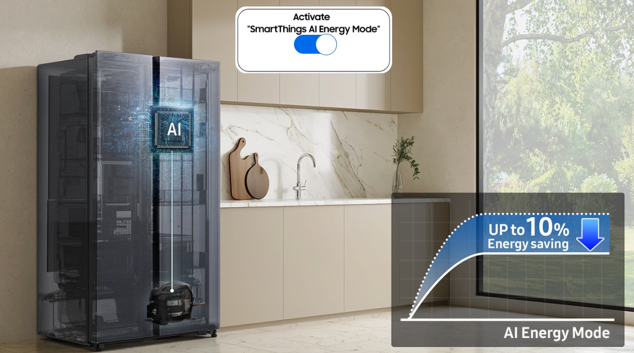 Παρακολουθήστε και εξοικονομήστε ενέργεια προληπτικά. Η Λειτουργία AI Energy αναλύει τα μοτίβα χρήσης του ψυγείου σας και εκτιμά την κατανάλωση ενέργειας με βάση την τεχνολογία AI. Εάν ο εκτιμώμενος λογαριασμός ηλεκτρικού ρεύματος υπερβαίνει τον προκαθορισμένο στόχο σας, σας συνιστά να ενεργοποιήσετε τη λειτουργία εξοικονόμησης ενέργειας για να μειώσετε την κατανάλωση ενέργειας έως και 10%.