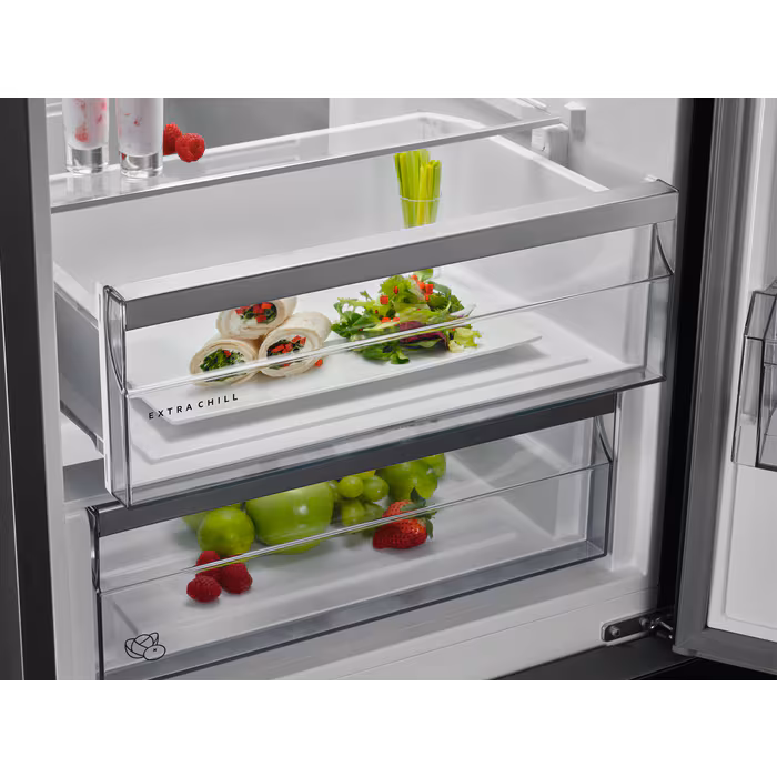 Καθυστερήστε την ωρίμανση των αγαπημένων σας τυριών και αλλαντικών αποθηκεύοντάς τα στο συρτάρι Extra Chill. Η ζώνη διατηρεί χαμηλότερη θερμοκρασία από το υπόλοιπο ψυγείο.